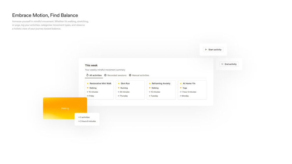 Observe your progress with a comprehensive activity log—list and calendar views offer a snapshot of your mindful journey. Dive into your experiences, fostering a sense of accomplishment and continuity in your mindful movement practice.