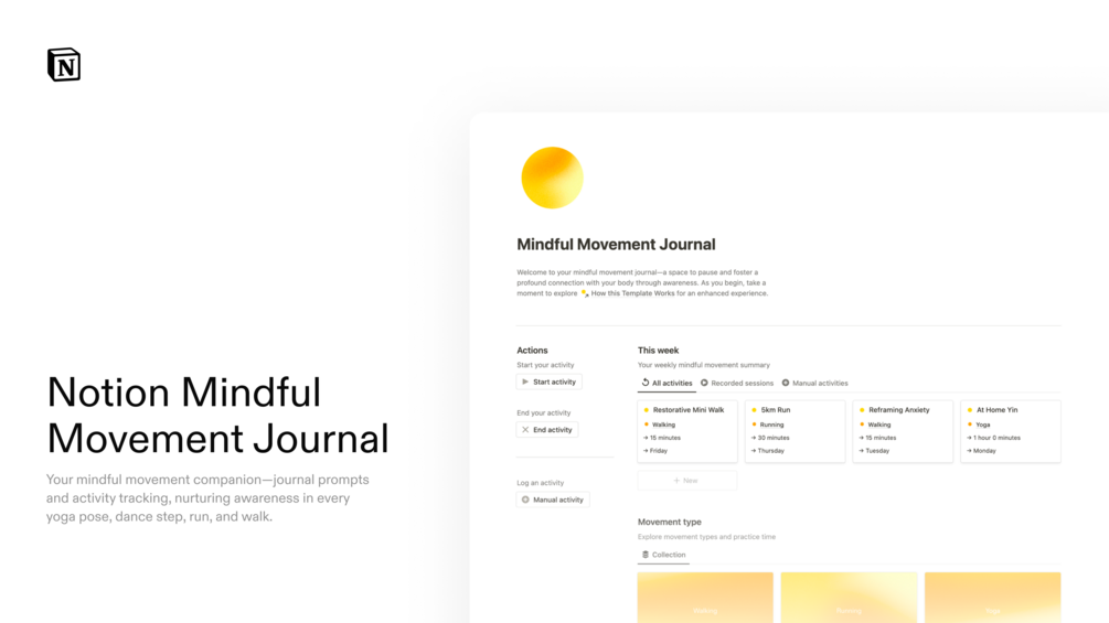 You will receive a mindful movement toolkit—guided journal prompts for intentional practices, organised activity types to track your journey, and an intuitive log for a seamless overview.